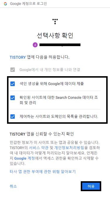 #5 TISTORY에 권한을 부여하는 창이 3가지 나올텐데 모두 허용하고, 다음과 같이 선택사항을 확인하신 뒤, 허용을 눌러줍니다.