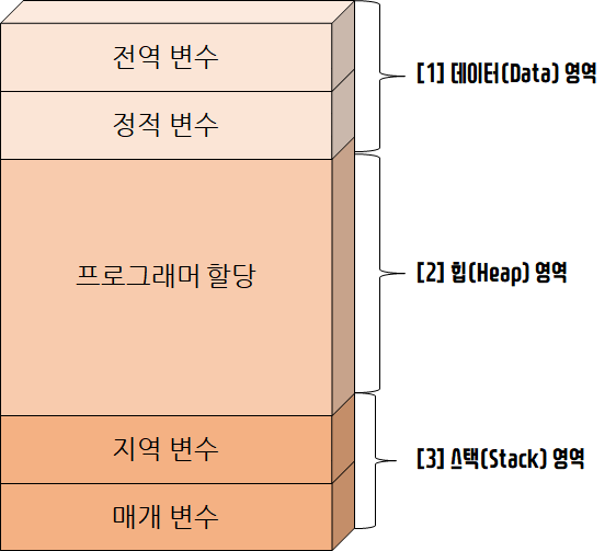 이 때 할당되는 메모리 영역은 크게 데이터(Data), 스택(Stack), 힙(Heap) 영역으로 3가지로 나뉜다.