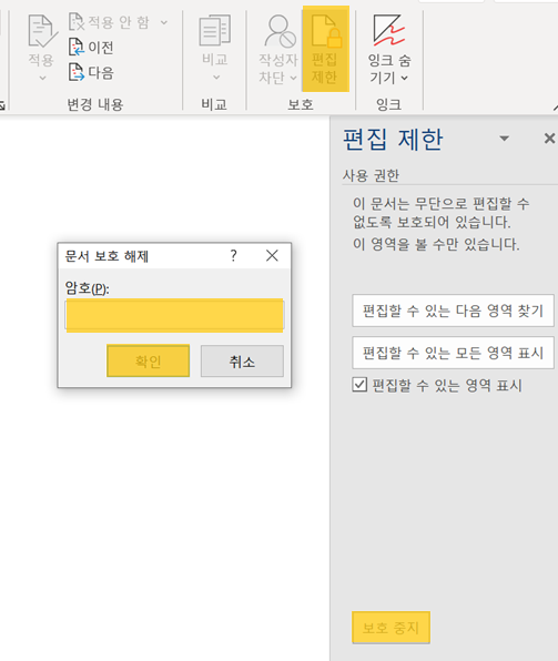 편집제한 -> 보호중지 에서 암호를 입력하여, 해제가 가능하다.