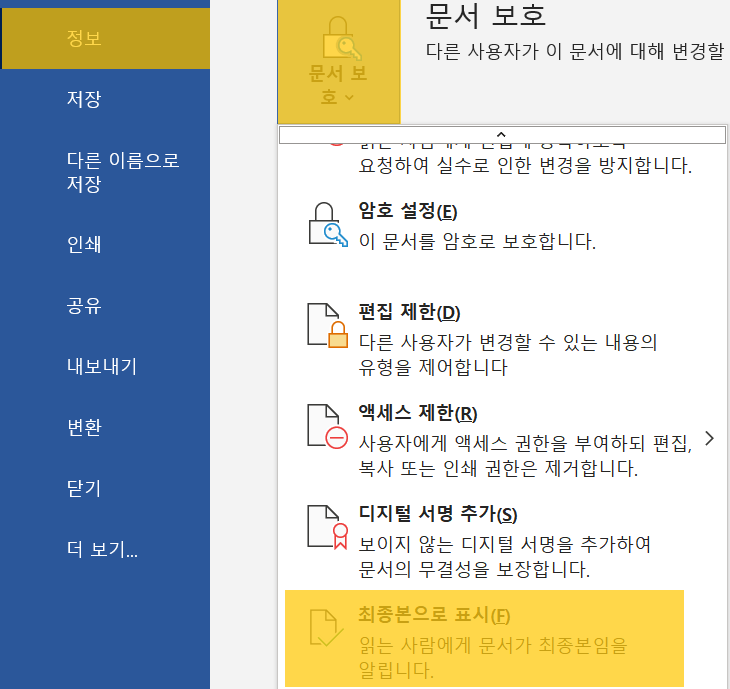최종본으로 표시하면 특정 편집 메뉴가 비활성화 된다.
