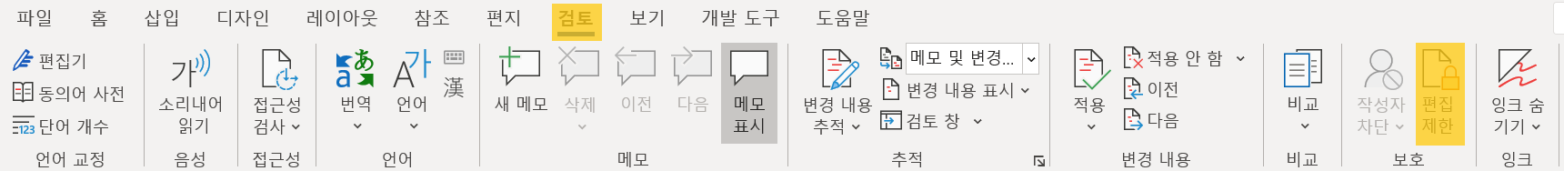 검토[탭] -> 보호[그룹] -> 편집 제한 클릭