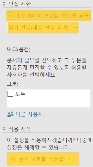 -> (3. 적용 시작 에서) 예, 문서 보호를 적용합니다. 선택