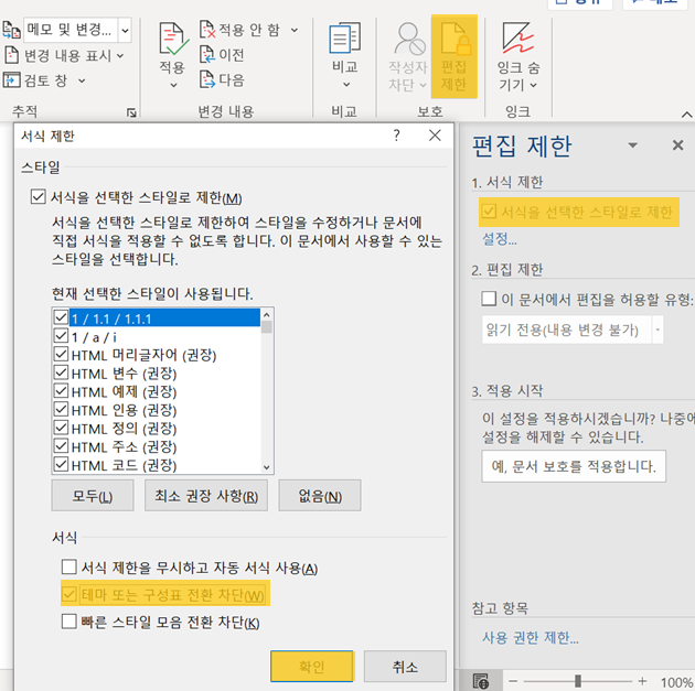 워드 문서의 서식,테마 스타일을 변경하지 못하도록 암호를 설정해 보호한다.