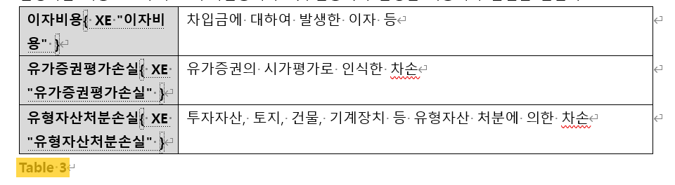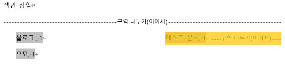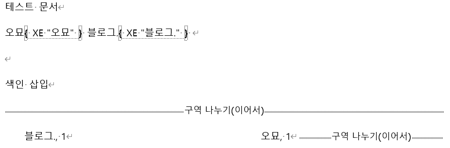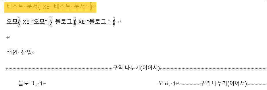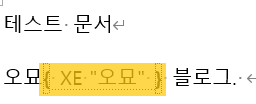다음과 같이, 색인 항목으로 지정한 텍스트 우측에 XE필드가 표시된다.