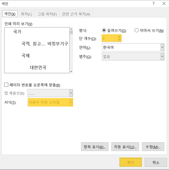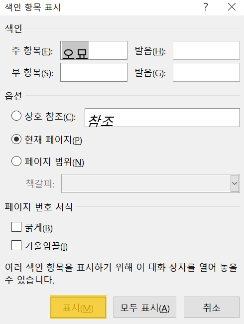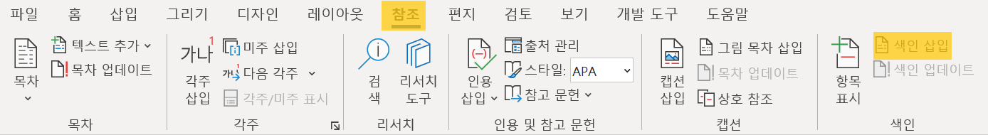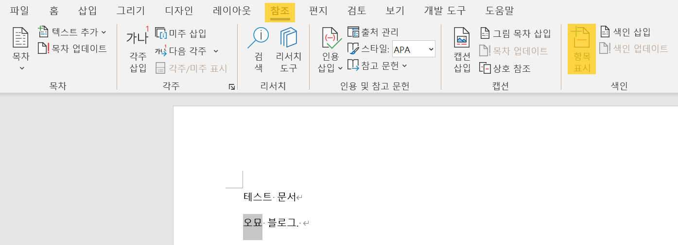 색인 항목으로 표시할 단어 드래그 -> 참조[탭] -> 색인[그룹] -> 항목표시 명령