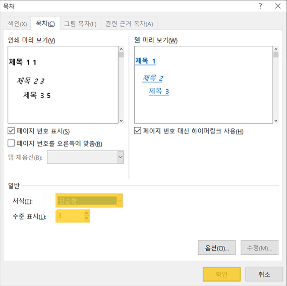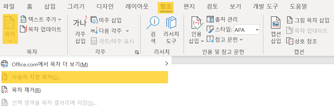 참조[탭] -> 목차[그룹] -> 목차 명령 -> 사용자 지정 목차(C)