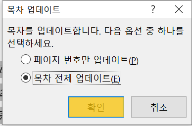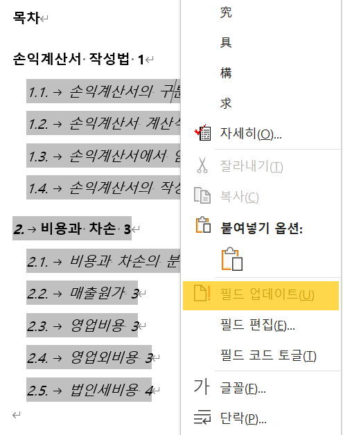 목차에 커서를 두고, 오른쪽 마우스를 클릭 -> 필드 업데이트(U)