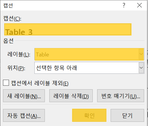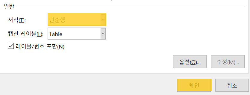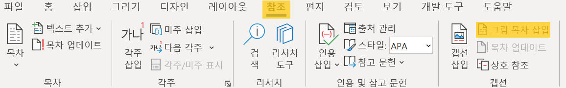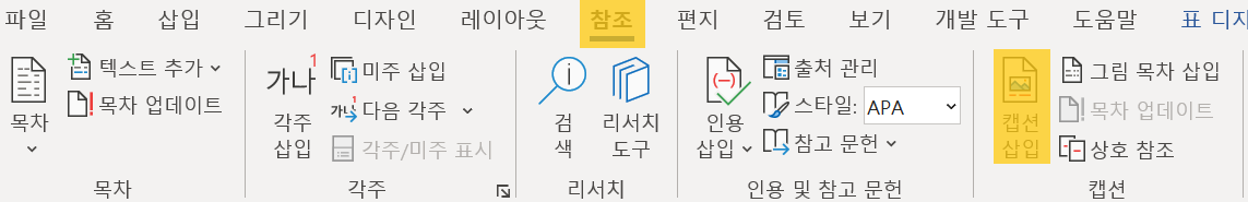 추가 하고자 하는 항목 클릭 후 참조[탭] -> 캡션[그룹] -> 캡션 삽입 명령