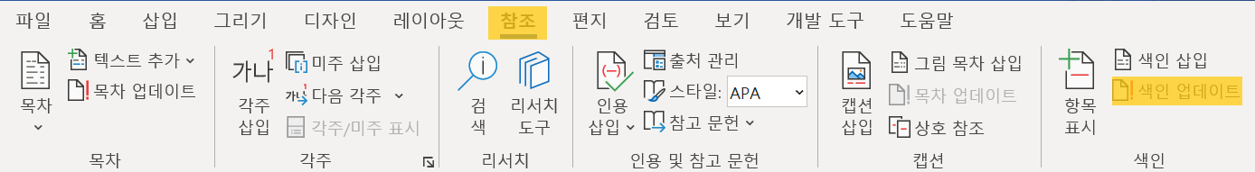참조[탭] -> 색인[그룹] -> 색인 업데이트 명령 or [F9]