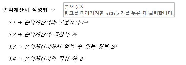 스타일 혹은 개요 수준이 설정되어 있는 제목 단락을 기준으로 간단하게 목차를 생성이 가능하다.