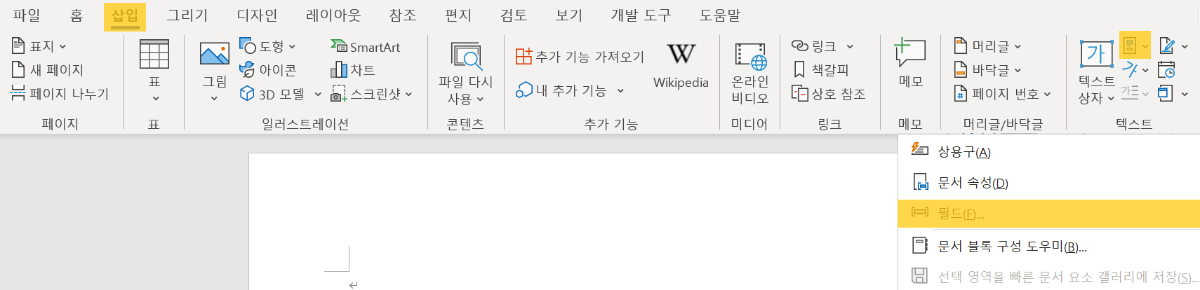 삽입[탭] -> 텍스트[그룹] -> 빠른 문서 요소 탐색[명령] -> 필드(F)