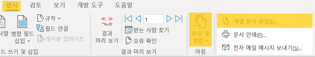 편지[탭] -> 마침[그룹] -> 완료 및 병합[명령] -> 개별 문서 편집(E) 선택