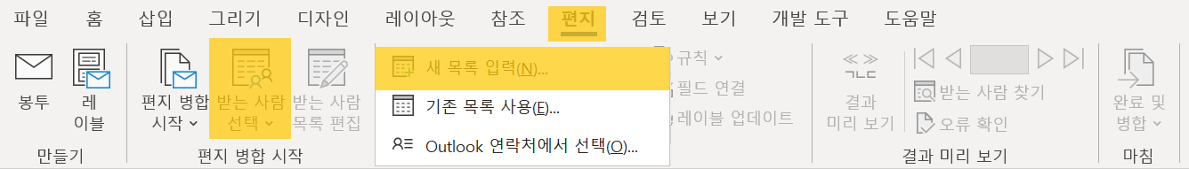 편지[탭] -> 편지 병합 시작[그룹] -> 받는 사람 선택[명령] -> 새 목록 입력(N) 클릭