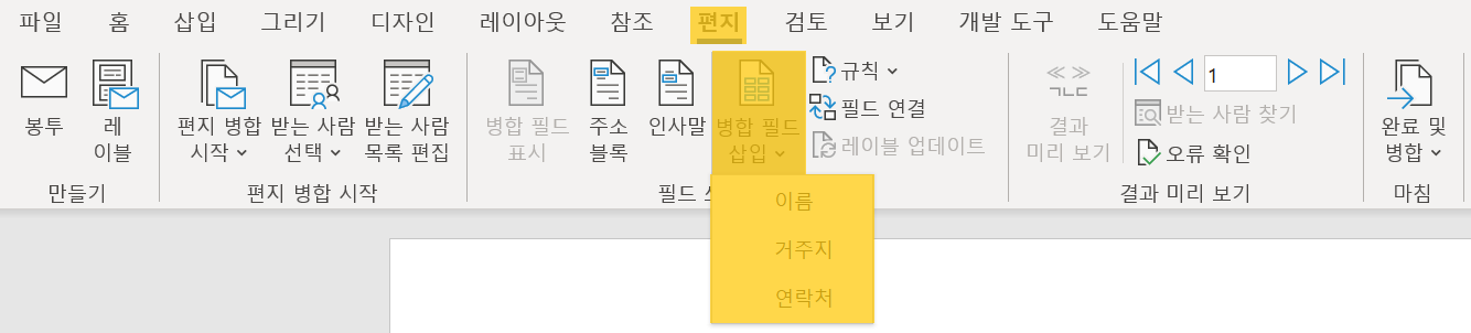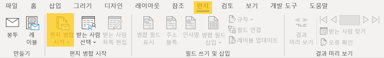 편지[탭] -> 편지 병합 시작[그룹] -> 편지 병합 시작[명령] -> 편지 클릭
