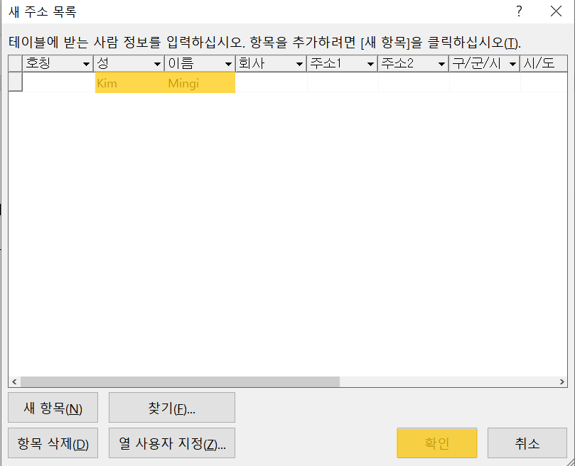 (새 주소 목록 창에서) 정보를 입력하고 확인