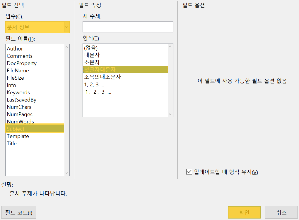 (완성 화면) Subject 필드를 선택했기에, 커서가 있던 위치에 문서의 주제가 표시된다.