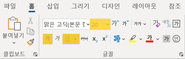 홈[탭] -> 글꼴[그룹] 에서 20pt, 굵게 , 밑줄을 선택한다.