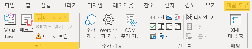 기록이 모두 끝났다면, 개발도구[탭] -> 코드[그룹] -> 기록중지[명령] 을 클릭