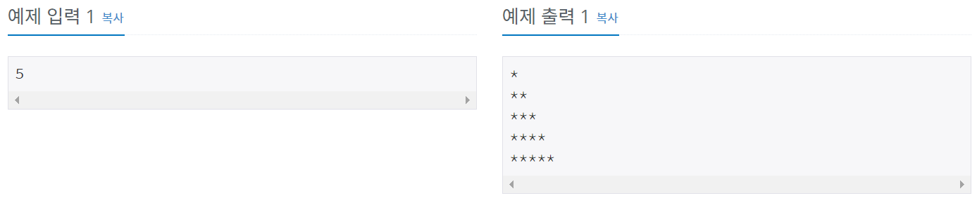 첫째 줄에는 별 1개, 둘째 줄에는 별 2개, N번째 줄에는 별 N개를 찍는 문제