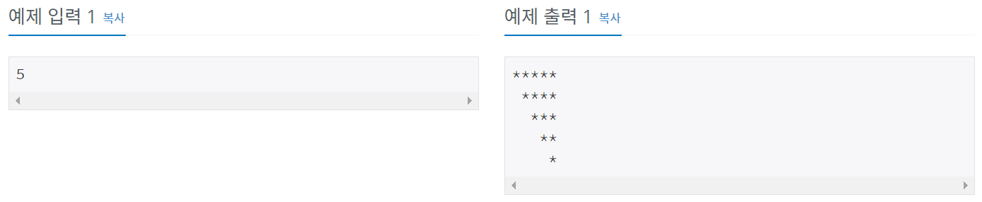 첫째 줄에는 별 N개, 둘째 줄에는 별 N-1개, ..., N번째 줄에는 별 1개를 찍는 문제 하지만, 오른쪽을 기준으로 정렬한 별(예제 참고)을 출력하시오.