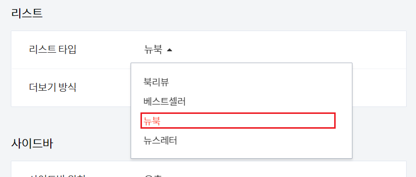 그리고, 쭉 내려서 리스트타입에 보시면, 초기값이 북리뷰로 설정되어 있을텐데,