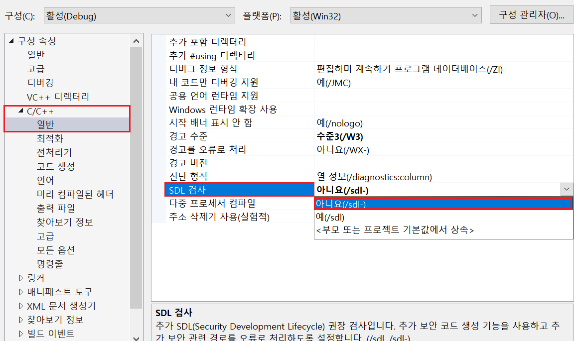 그리고 속성창에서 C/C++ -> 일반 -> SDL 검사로 가보면,