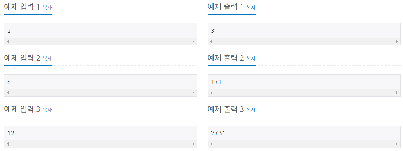 2×n 직사각형을 1×2, 2×1과 2×2 타일로 채우는 방법의 수를 구하는 프로그램을 작성하시오.
