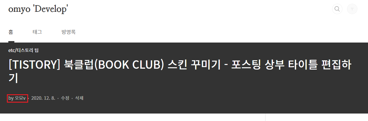 | [TISTORY] 북클럽(BOOK CLUB) 스킨 꾸미기 - 포스팅 상부 타이틀 편집하기 (0) | 2020.12.08 |
