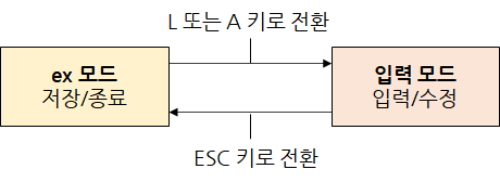 입력모드에서 텍스트 입력이 끝났다면, Esc 키로 ex 모드로 전환 할 수 있다.
