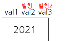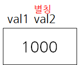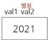 다음과 같이 선언하면, val1 메모리 공간에, val2 라는 이름(별칭)이 하나 더 붙게 된다.
