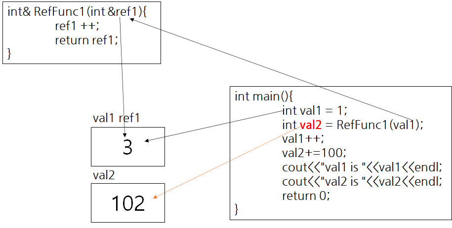 마지막으로, 참조형 반환값을 참조자에 받았기에, val2 라는 별칭이 추가로 생긴다. int &val2 = ref1;