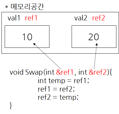 Swap 함수는 매개변수가 참조자 형태로 선언 되었기에, 변수 val1과 val2에 각각 ref1과 ref2라는 별칭이 붙게되고,