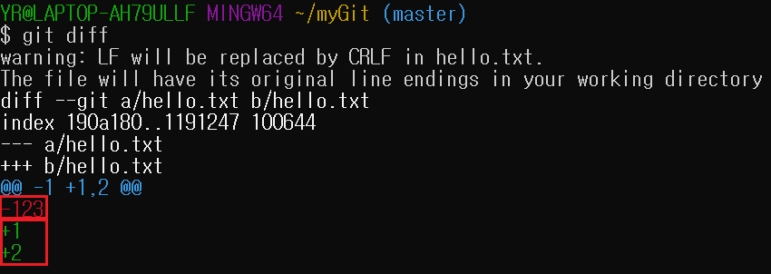 빨간색으로 표시된 - 문구는, 수정된 hello.txt 파일에서 123이 삭제 되었다는 뜻이고,
