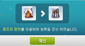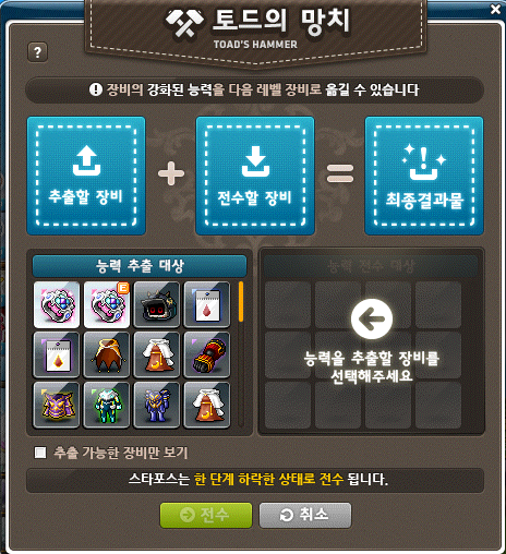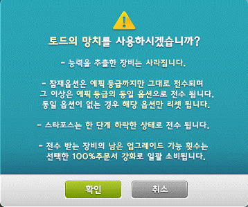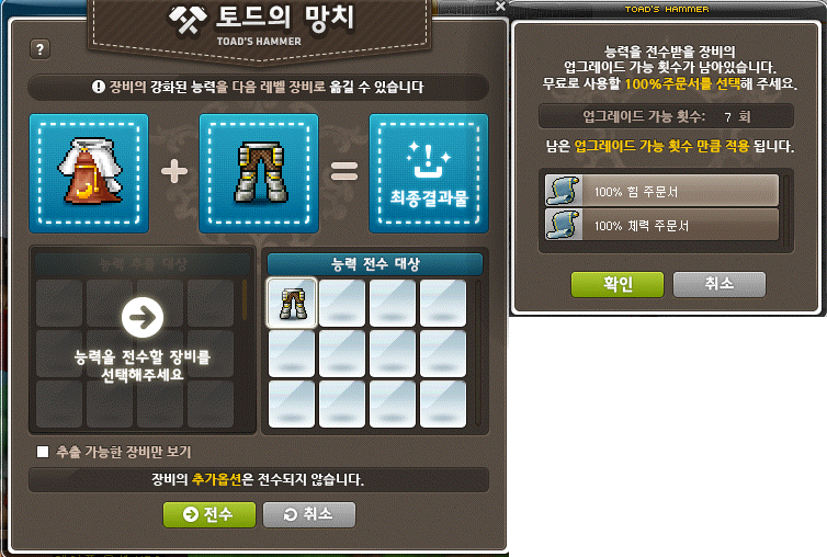 토드의 망치는 간단히 말해서 같은 부위의 저레벨의 아이템의 잠재능력을 고레벨 아이템으로 옮기는 것인데요,