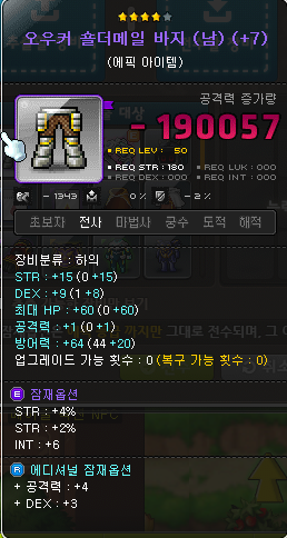 한벌옷은 예외입니다! 한벌옷 아이템은 상의 아이템이나 하의 아이템으로 잠재능력을 옮길 수 있습니다.