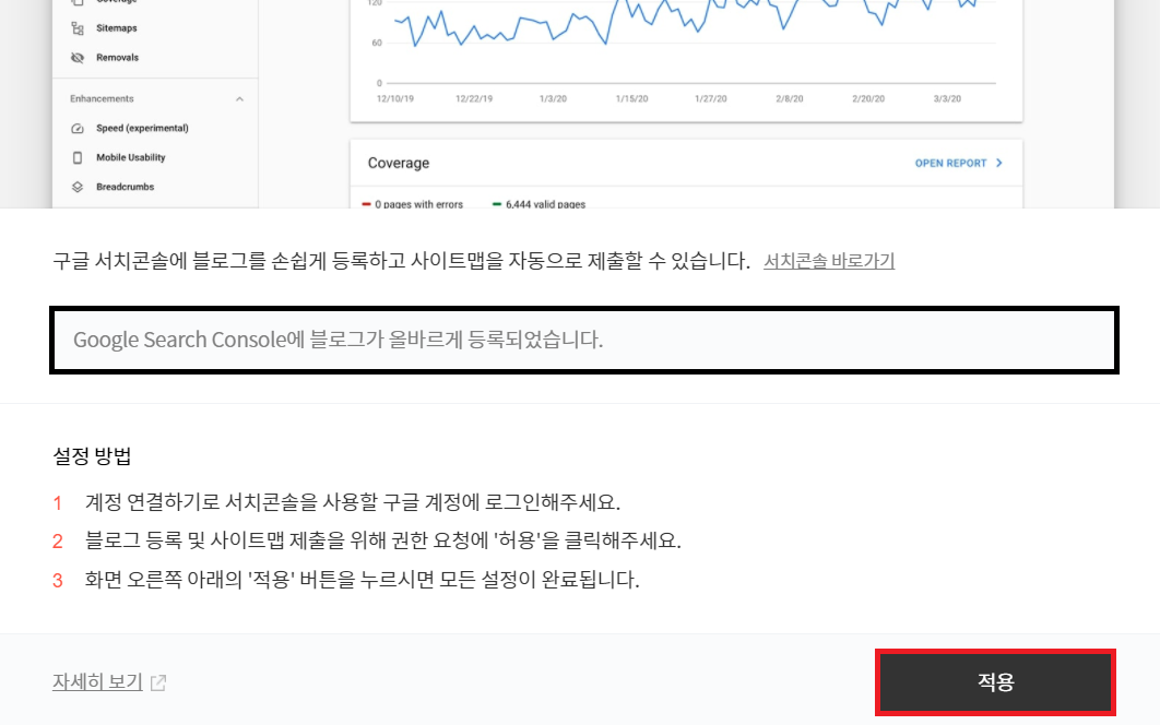 'Google Search Console에 블로그가 올바르게 등록되었습니다'라는 문구가 나타나면 '적용' 버튼을 눌러줍니다.